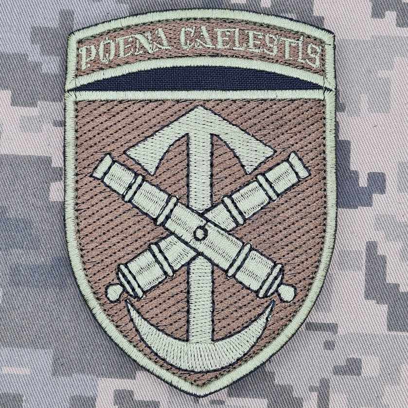 Польовий варіант шеврону 52 окрема артилерійська бригада з девізом Poena Caelestis – Кара Небесна (латинь), або ж Кара з Небес